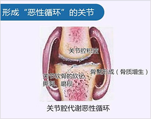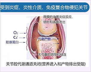 强直性脊柱炎发病机理是由于机体免疫反应产生的无菌性炎症附着在关节及脊柱组织,增生形成炎性“包裹层”,导致药物及营养进不去,关节腔内的免疫复合物和致病因子出不来,形成“恶性循环”从而推动整个病情发展,特别是病情进入中期后,侵蚀骨质,造成软骨及骨质损伤,因此单一的口服和注射药物已经无法达到治愈效果。